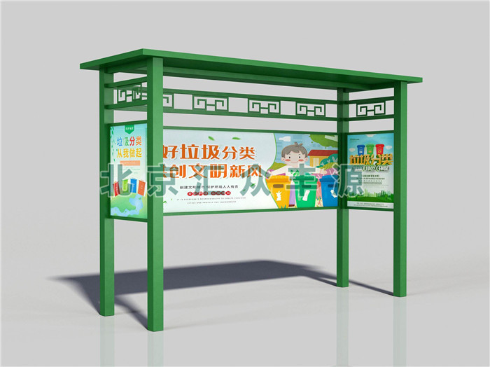北京匯眾豐源垃圾分類亭,分為地基基礎(chǔ)設(shè)施、公益宣傳欄、立柱、頂棚等,亭內(nèi)設(shè)置可回收、有害垃圾、廚房垃圾和其他垃圾等垃圾桶宣傳欄。
